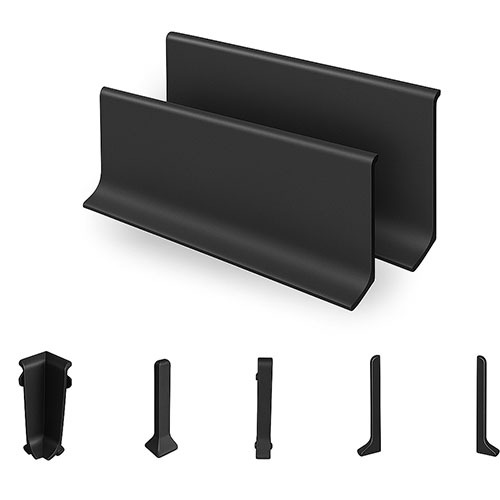 Zusätzlich zu den Aluminium-Sockelleisten bieten wir passende Endkappen, Innen- und Außenecken sowie Verbinder für alle drei Oberflächenvarianten (Silber matt, Schwarz und Gold matt) an.