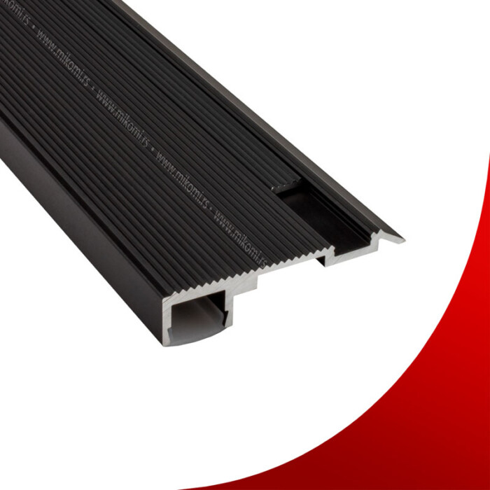 Aluminijumski LED profil za stepenište. Postavlja se naknadno na već ugrađene keramičke ili granitne pločice i druge vrste podova. Izrađen je od aluminujuma – eloxa. Dostupan u boji srebra. Uz ovaj model lajsne se isporučuje bez difuzora. Difuzore možete naći na sledećim linkovima: